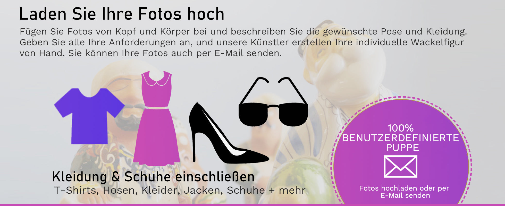 Wenn Sie kein Standard-Körperdesign finden, das Ihnen gefällt, dann ist eine 100 % maßgefertigte Wackelkopfpuppe von Kopf bis Fuß die richtige Wahl für Sie. Mit dieser Option können Sie Ihre Wackelkopfpuppe, einschließlich ihres Körpers und ihrer Pose, frei gestalten. Diese benutzerdefinierten Optionen sind unbegrenzt – wenn Sie es sich vorstellen können, können wir es erstellen!