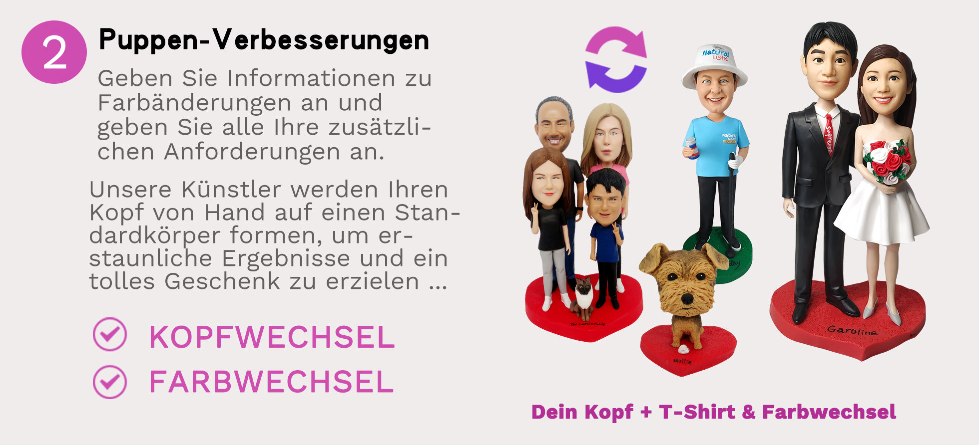In der Regel wählen Kunden zwischen einem Standard-Körperdesign (Stockkörper) oder einer komplett maßgefertigten Puppe von Kopf bis Fuß. Die Standardkörperoption ermöglicht es Ihnen, einen vorhandenen Standardkörper zu verwenden, der einen neuen Kopf erhält, der anhand der eingereichten Fotos modelliert wurde. Obwohl es sich um eine Serienkarosserie handelt, sind immer noch viele anpassbare Optionen verfügbar, z. B. Farbänderungen oder Basisoptionen.